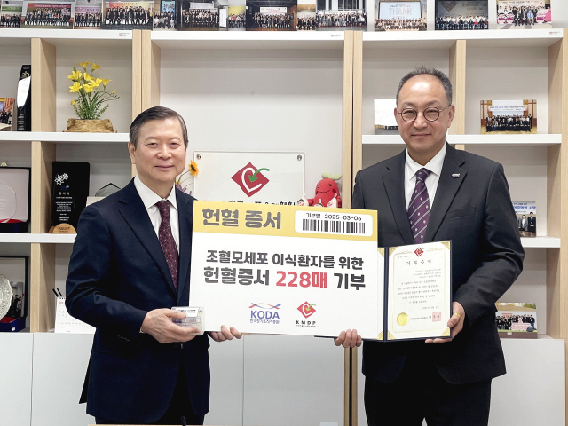 한국장기조직기증원(원장 이삼열)은 지난 6일 임직원들이 기부한 헌혈증서 228매를 한국조혈모세포은행협회(회장 이홍기)에 전달했다.