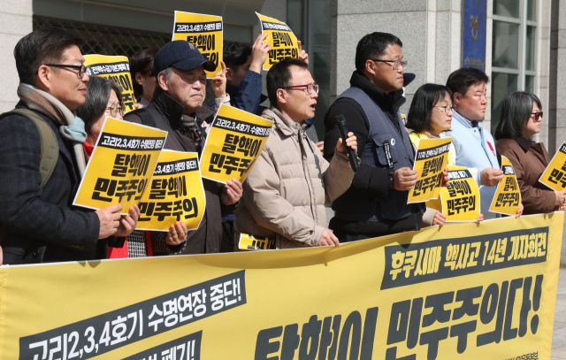 기후위기부산비상행동, 탈핵부산시민연대 등 부산 지역 환경단체들이 11일 부산시청 앞 광장에서 정부의 핵 관련 정책을 비판하며 ‘후쿠시마 핵사고 14년 기자회견’을 하고 있다.