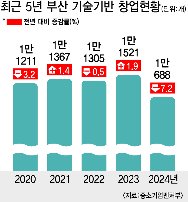 부산의 기술 기반 창업은 최근 4년간 소폭 상승해 오다 올해 급격히 줄어들었다. 2020년 1만 1211개였던 기술 창업 기업은 2021년 1만 1376개로 늘었다가 2022년 다시 1만 1305개로 줄었다. 이후 2023년 1만 1521개로 소폭 다시 늘었다가 지난해 1만 688개로 떨어졌다.
