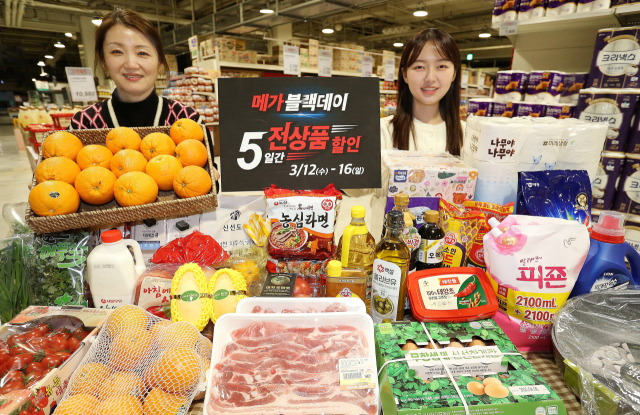 ㈜메가마트는 연중 최대 규모 할인 행사로 매장 내 모든 상품을 할인하는 올해 첫 ‘메가블랙데이’를 12~16일 5일간 진행한다. 메가마트 부산 동래점에서 직원이 행사 상품을 선보이고 있다. 메가마트 제공