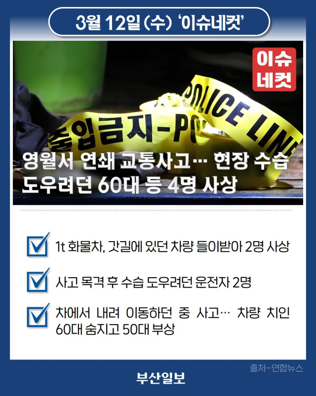영월서 연쇄 교통사고…현장 수습 도우려던 60대 등 4명 사상