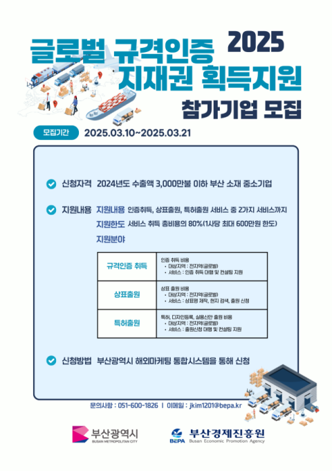 부산시(시장 박형준)와 부산경제진흥원(원장 송복철)은 지역 중소기업의 수출품에 대한 해외규격인증 취득과 지식재산권 확보를 위한 지원사업을 확대 추진한다고 밝혔다.