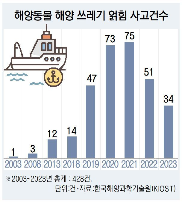 한국해양과학기술원(KIOST)은 2003년부터 20년 동안 해양동물의 해양쓰레기 얽힘 피해 데이터를 분석한 결과, 시간에 따라 증가하는 추세를 보였다고 12일 밝혔다. 또한 해안에서는 ‘조류’가 ‘낚시도구’에 의한 피해를, 수중에서는 ‘어류’가 ‘폐그물’로 인한 피해를 가장 많이 입었다고 전했다.