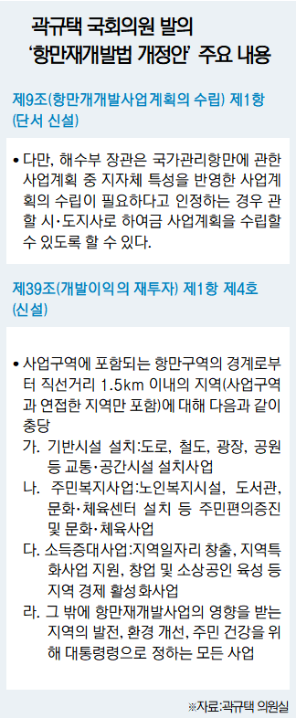 곽 의원은 “항만 재개발 사업이 도시 개발과 형성에 직접적이고 상당한 영향을 미치고 있음에도 사업 권한이 해수부 장관에게 집중돼 있어 항만과 기존 도심의 조화로운 발전을 저해하고, 지자체와의 역할이나 기능이 조율되지 못하는 문제점이 발생해 왔다”며 “항만 소재 광역단체의 입안권을 확대하도록 개정안을 발의했다”고 설명했다.