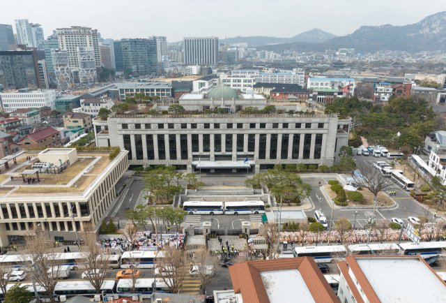 지난 12일 서울 종로구 헌법재판소 주변에 경찰 버스가 배치된 모습. 연합뉴스