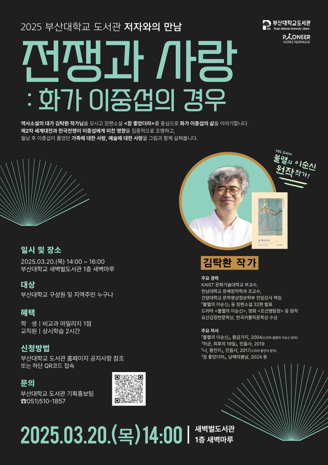 이번 강연은 부산대 구성원 및 지역민 누구나 참석 가능하며, 사전 신청 참가자 50명에게는 김탁환 작가의 신간 <참 좋았더라>를 증정한다. 강연은 부산대 도서관 유튜브를 통해 온라인으로도 동시 중계된다.