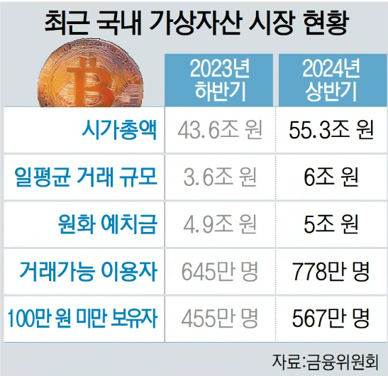 국내에서도 법인의 가상자산 시장 참여가 유동성 증가에 긍정적인 영향을 줄 것으로 전망된다. 금융위원회에 따르면 2024년 6월 기준 국내 가상자산 시장 시가총액은 55조 3000억 원으로 전년 말 대비 27% 증가했다. 하루 평균 거래 규모도 3조 6000억 원에서 6조 원으로 1.6배 증가했다.