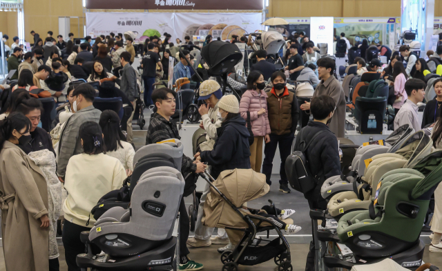 16일 부산 해운대구 벡스코에서 열린 2025 부산 베이비페어를 찾은 관람객들이 카시트와 유모차 등 부스 내 다양한 육아 용품들을 살펴보고 있다. 이번 행사는 180개사 300부스로 부산, 경남 최대 규모로 진행했다.