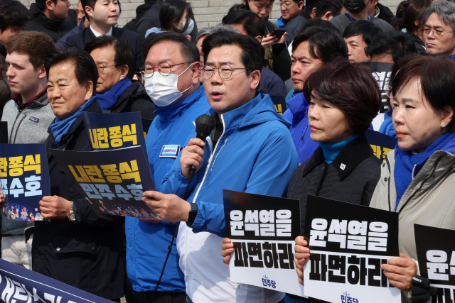 헌법재판소의 윤석열 대통령 탄핵심판 선고가 임박한 가운데 16일 서울 종로구 헌법재판소 앞에서 국민의힘 의원들이 탄핵 각하를 촉구하며 릴레이 시위를 이어가고 있다(위). 같은 날 ‘윤석열 대통령 파면 촉구’ 도보 행진에 참가한 더불어민주당 박찬대 원내대표가 서울 여의도 국회에서 광화문 농성장을 향해 출발하기에 앞서 발언하고 있다. 연합뉴스