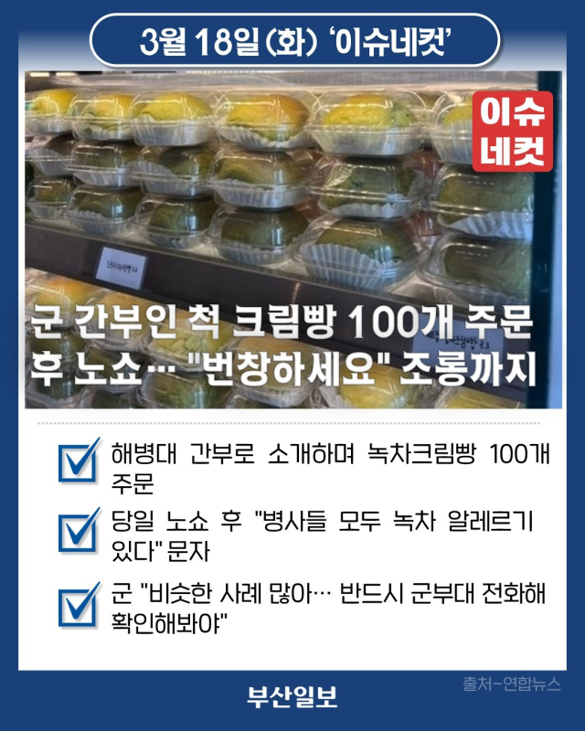 군 간부인 척 녹차크림빵 100개 주문 후 노쇼… "번창하세요" 조롱 문자까지 [이슈네컷]