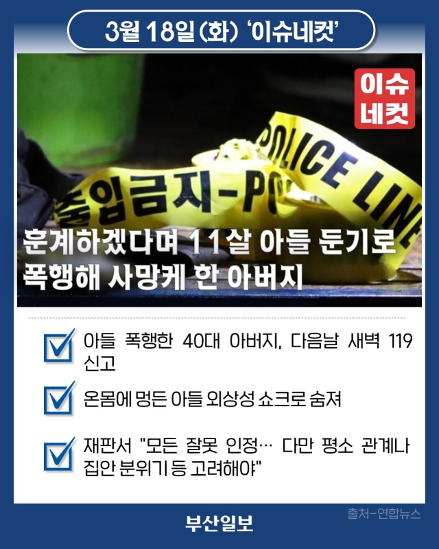 초등학생인 11살 아들을 온몸에 멍이 들 정도로 때려 숨지게 한 40대 아버지가 법정에서 혐의를 인정했습니다. 18일 인천지법 형사12부 심리로 열린 첫 재판에서 아동학대 범죄의 처벌 등에 관한 특례법상 아동학대치사 혐의로 구속 기소된 40대 A 씨의 변호인은 "피고인이 피해자 사망과 관련한 모든 잘못을 인정하고 있다"고 말했습니다. 이어 "피고인 입장과 무관하게 평소 피해자와의 관계나 집안 분위기 등 양형에 고려할 요소가 있다"며 A 씨의 아내를 증인으로 신청했습니다. A 씨는 지난 1월 16일 인천시 연수구의 아파트에서 초등학교 5학년생인 아들 B(11) 군을 야구방망이로 폭행해 숨지게 한 혐의를 받습니다. 그는 범행 다음 날 새벽 "아들이 숨을 쉬지 않는다"며 스스로 119에 신고했고, B 군은 온몸에 멍이 든 채 119구급대에 의해 종합병원으로 옮겨졌으나 '외상성 쇼크'로 숨졌습니다. 당시 A 씨는 경찰 조사에서 "아들이 거짓말을 하고 말을 듣지 않아 훈계하려고 때렸다"고 진술했습니다. 경찰은 아동학대살해 혐의를 A 씨에게 적용할지를 검토했으나 살인의 고의성을 인정하기 어렵다고 판단했습니다.