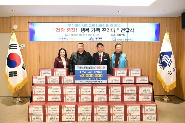 부산 동래구(구청장 장준용)는 지난 11일 부산마린시티로타리클럽(회장 문영기)으로부터 1인 가구 지원을 위한 성품 꾸러미 60박스(300만 원 상당)를 기탁받았다.