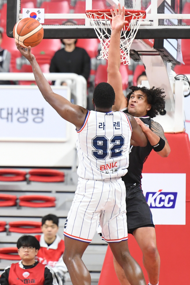 프로농구 부산 KCC는 18일 울산 동천체육관에서 열린 2024-2025 프로농구 정규리그 울산 모비스와의 경기에서 77-79로 패하며 8위에 머물렀다. 사진은 KCC의 캐디 라렌이 상대 선수를 앞두고 슛을 시도하고 있는 모습. KBL제공