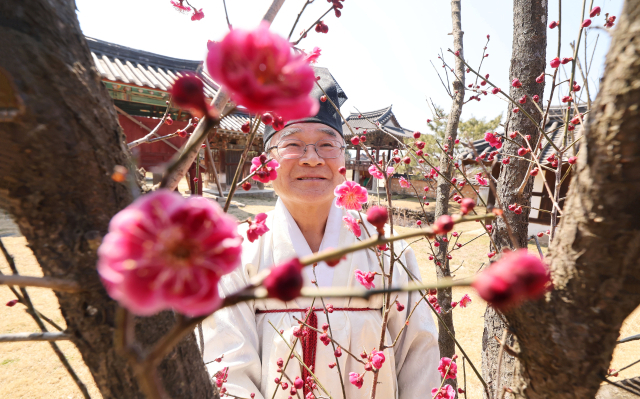 19일 경남 함양군 수동면 남계서원에서 춘계제향을 마친 유림이 앞마당에 활짝 핀 홍매화를 감상하고 있다. 남계서원은 1552년 조선 성리학자인 일두 정여창 선생을 추모하기 위해 창건된 서원이다. 함양군 제공