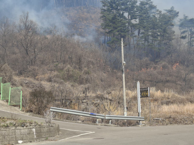 산불은 산중턱에서 번져 도로 인근까지 내려왔다. 나무 밑으로 시뻘건 불길이 보이고 있다. 김현우 기자