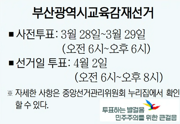 A. 3월 28일(금), 29일(토) 이틀간 실시한다. 투표 시간은 오전 6시부터 오후 6시까지다. 사전투표소는 부산을 포함한 재·보궐선거 지역의 모든 읍·면·동에 1곳씩 설치된다. 유권자는 별도 신고 없이 가까운 사전투표소에서 투표할 수 있다. 사전투표소의 자세한 위치는 선거관리위원회 홈페이지(www.nec.go.kr)에서 확인 가능하다.