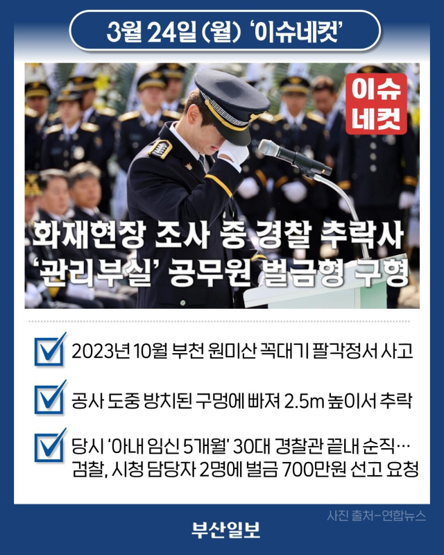 2023년 10월 경기도 부천시 원미산 정상의 팔각정에서 화재 현장을 살피던 30대 경찰관이 추락해 숨지는 사고가 발생했습니다. 검찰은 당시 안전 조치를 제대로 하지 않은 부천시청 공무원 2명에 각각 벌금 700만원을, 정비공사 담당 현장소장에 금고 1년 6개월을 구형했습니다. 이들은 사고 3개월 전 보수공사 중이던 팔각정이 무너질 가능성에 구멍이 뚫린 바닥을 방치한 채로 작업을 중단했는데요. 이후 A 경찰관이 사고 당일 새벽 불이 났던 팔각정 2층에서 화재 경위를 조사하던 중 이 구멍에 빠지면서 2.5m 아래로 추락했습니다. 당시 아내가 임신 5개월이던 '예비 아빠' A 경찰관은 이틀 뒤 숨졌고, 같은 해 12월 '위험직무 순직'을 인정받았습니다.