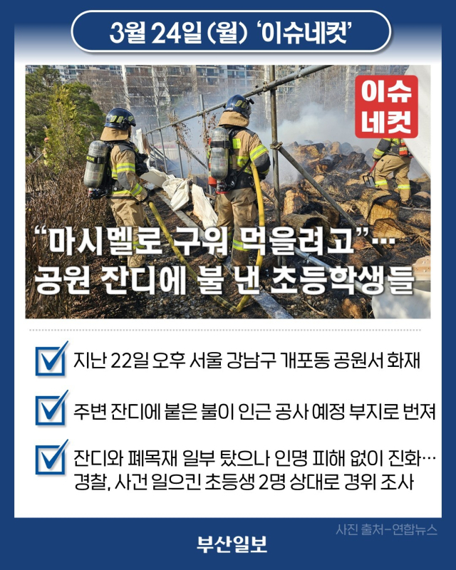 서울 수서경찰서는 지난 주말 공원에서 불을 낸 초등학생 2명을 조사 중이라고 밝혔습니다. 경찰과 소방에 따르면 이들은 22일 오후 3시께 강남구 개포동 공원에서 마시멜로를 구워 먹으려 잔디에 불을 붙였는데요. 주변 잔디로 옮겨붙은 불이 인근 공사 예정 부지까지 번지고 말았습니다. 소방 당국은 인력 67명과 차량 17대를 투입해 1시간 만에 불을 완전히 껐습니다. 잔디와 폐목재 등이 일부 탔으나 다행히 인명피해는 없었습니다. 불을 낸 초등학생들은 모두 촉법소년(14세 미만)인 것으로 파악된 가운데, 경찰은 이들을 상대로 정확한 화재 경위를 조사할 방침입니다.