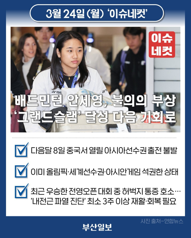 한국 배드민턴 간판 안세영이 불의의 부상으로 다음달 8일부터 중국에서 열리는 아시아선수권대회에 출전하지 못하게 됐습니다. 2023년 항저우 아시안게임과 세계선수권대회를 석권하고, 지난해에는 파리 올림픽 금메달을 목에 건 안세영은 '배드민턴 그랜드슬램' 달성을 위해 아시아선수권대회를 정조준했으나 다음 기회를 기약하게 됐습니다. 올해 들어 국제대회 4회 연속 우승의 위업을 달성한 세계랭킹 1위 안세영은 지난 17일 막을 내린 전영오픈 대회에서 허벅지 통증을 처음 호소한 뒤, 결승에서도 통증을 안은 채로 승리를 거뒀는데요. 귀국 이후 오른쪽 허벅지 내전근 일부 파열로 3주가량 재활 등 회복에 집중해야 한다는 진단을 받았습니다.