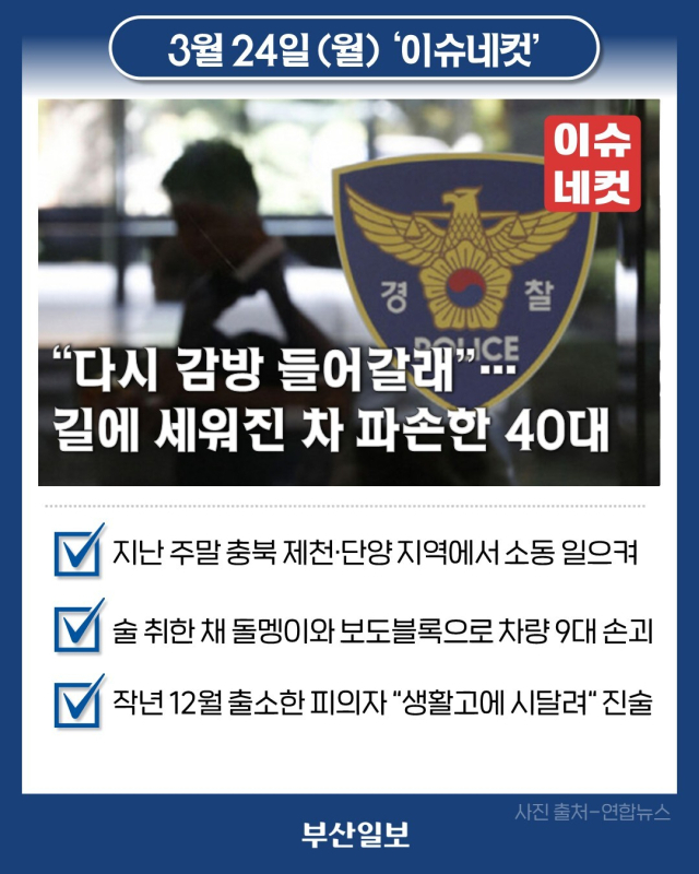 충북 단양경찰서는 재수감될 목적으로 길거리에 세워진 차량 9대를 파손한 혐의(특수재물손괴 등)를 받는 40대 B 씨에 대해 구속영장을 신청했습니다. B 씨는 지난 22∼23일 제천과 단양 지역에서 술에 취해 길가에 세워진 차량 9대를 돌멩이와 보도블록으로 파손한 혐의를 받는데요. 경찰은 피해 차주로부터 신고받고 B 씨를 쫓던 중 단양의 한 식당에서 무전취식으로 문제를 일으킨 그를 현행범으로 체포했습니다. 유사 범행으로 1년 6개월의 수감 생활을 끝내고 지난해 12월에 출소했던 B 씨는 경찰에서 "생활고에 시달려 다시 감방에 갈 생각으로 범행했다"고 진술한 것으로 알려졌습니다.