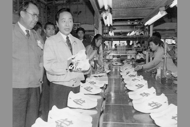 1994년 당시 김영삼 대통령이 부산지역 한 신발 제조업체를 방문해 제조라인을 둘러보는 모습. 이 때에도 부산은 법인세 5배 중과 등으로 인해 벌써 20년이 넘도록 기업 이탈이 심화한 상태였다. 부산일보DB