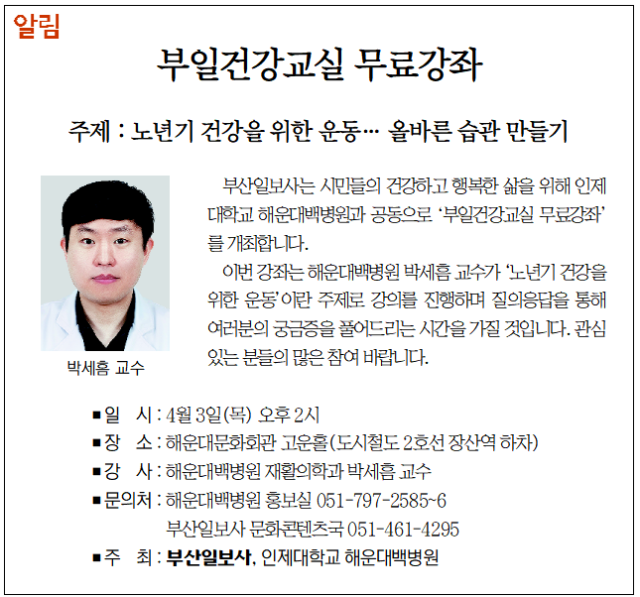 부산일보사는 시민들의 건강하고 행복한 삶을 위해 인제대학교 해운대백병원과 공동으로 '부일건강교실 무료강좌'를 개최합니다.