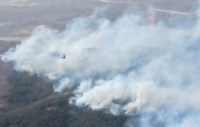 경북 의성군 산불 발생 나흘째인 25일 의성군 안계면 안정리 일대에서 산불이 강한 바람을 타고 인근 야산으로 번지고 있다. 연합뉴스