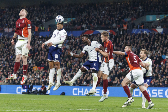 25일(한국 시간) 영국 런던에서 열린 잉글랜드와 라트비아의 월드컵 예선 축구 경기에서 잉글랜드 주드 벨링엄이 공중볼을 따내고 있다. 잉글랜드는 이 경기에서 리스 제임스, 해리 케인, 에베레치 에제의 릴레이 득점에 힘입어 3-0으로 이겼다. EPA연합뉴스