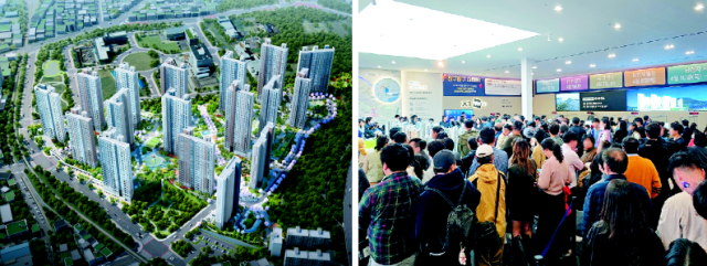 경남 창원시 진해구 여좌동에 ‘메가시티 자이&위브’가 들어선다. 창원에 새 주거문화를 도입할 ‘메가시티 자이&위브’의 야경 투시도(위로부터 반시계 방향)와 조감도. 견본주택을 찾은 분양 예정자들. 두산건설 컨소시엄 제공