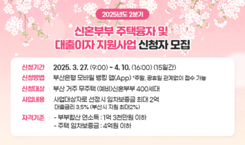 부산시(시장 박형준)는 올해 2분기 '신혼부부 주택융자 및 대출이자 지원사업'의 지원 대상자를 3월 27일부터 4월 10일까지 모집한다고 밝혔다.