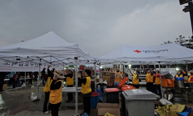 27일 경북 의성군 산림청 산불 현장 지휘 본부 일대에 비가 내리자 자원봉사자들이 환호성을 내지르고 있다. 연합뉴스