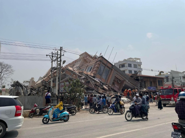미얀마 중부 내륙에서 28일 발생한 규모 7.7의 강진으로 진앙에서 가까운 미얀마 제2 도시 만달레이를 비롯해 미얀마 전역에 대규모 피해가 발생한 것으로 전해졌다. 사진은 이날 강진으로 무너진 미얀마 아웅반 호텔의 모습. 연합뉴스