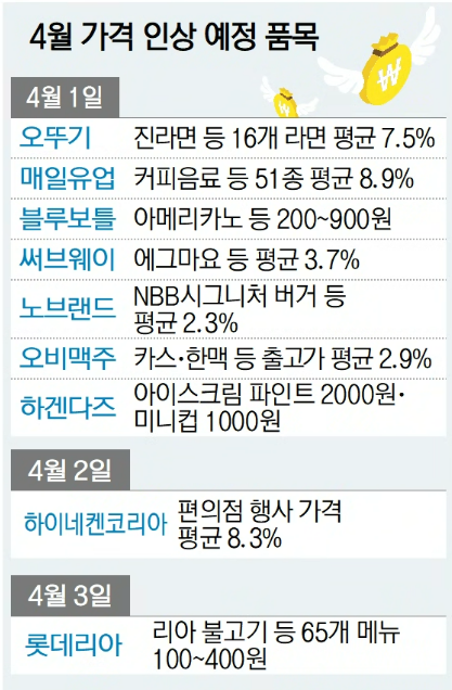 4월에도 가격 인상은 계속될 예정이다. 4월 1일 오비맥주와 오뚜기 라면·카레, CJ제일제당 비비고 만두, 하겐다즈 아이스크림, 남양유업 음료, 롯데웰푸드 소시지 등의 가격이 오른다. 가정용 시장의 40% 이상을 차지한 오비맥주 카스는 편의점에서 병과 캔이 100~250원 오르고, 대형마트에서도 평균 7%씩 인상한다. 하이네켄, 칼스버그, 기네스 맥주도 각각 10%가량 인상된다.