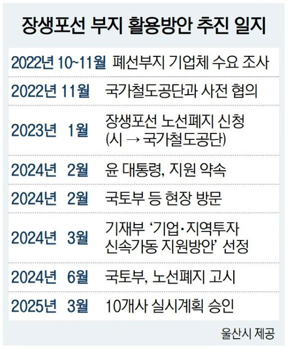 앞서 울산시는 2022년 10월부터 노선 인근 기업들과 간담회를 열고 투자 수요 등을 파악했다. 그후 2023년부터 국가철도공단에 노선 폐지를 공식 요청하고 현장 점검과 관계기관 협의에 주력했다. 특히 지난해 초 윤석열 대통령이 울산 민생토론회에서 장생포선 부지 활용에 대한 정잭적 지원 의지를 밝히면서 후속 조치가 급물살을 탔다.