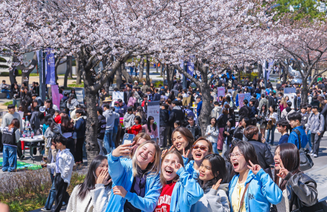 31일 오후 부산 남구 부경대학교 대연캠퍼스에서 열린 봄 축제 ‘핑크 캠퍼스’에 참가한 외국인 유학생들이 활짝 핀 벚꽃을 배경으로 기념사진을 찍고 있다.