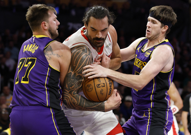 1일(한국 시간) 미국 캘리포니아주 로스앤젤레스의 크립토닷컴 아레나에서 열린 2024-2025 NBA 정규리그 경기에서 휴스턴 로키츠의 스티븐 아담스가 LA 레이커스의 오스틴 리브스와 루카 돈치치를 상대로 볼을 컨트롤하고 있다. 이날 레이커스는 휴스턴을 104-98로 물리쳤다. AFP연합뉴스