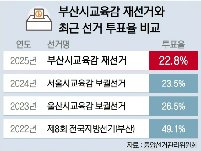 특히 전국에서 최근 3년간 치러진 교육감 선거 투표율이 모두 30%에 미치지 않아 교육감 직선제 한계를 지적하는 목소리도 높아진다. 2023년의 울산시교육감 보궐선거는 26.5%, 2024년 서울시교육감 보궐선거는 23.5%였는데, 이번 부산시교육감 재선거 투표율은 이보다도 낮았다.