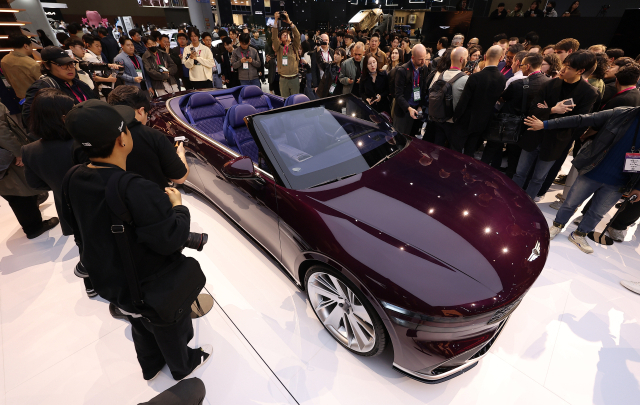 3일 경기도 고양시 킨텍스에서 열린 ‘2025 서울모빌리티쇼 미디어 브리핑’ 행사에서 관람객들이 콘셉트카 ‘엑스 그란 컨버터블’을 둘러보고 있다. 연합뉴스