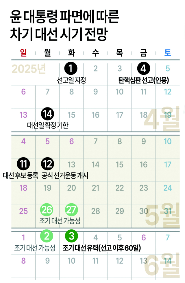 헌재가 이날 윤 전 대통령 파면을 결정하면서 조기 대선판이 열리게 됐다. 헌법엔 ‘대통령이 궐위된 때 또는 기타의 사유로 그 자격을 상실한 때에는 60일 이내에 후임자를 선거한다’고 명시돼 있다. 공직선거법에도 ‘대통령의 궐위로 인한 선거 또는 재선거는 그 선거의 실시 사유가 확정된 때부터 60일 이내에 실시한다’고 규정한다. 한덕수 대통령 권한대행은 헌재의 탄핵결정 선고 10일 이내에 대선일을 공고해야 한다. 이에 따라 한 대행은 오는 14일 이전에 대선일을 공고할 것으로 보인다. 대통령 선거는 5월 24일부터 6월 3일 중 치러질 것으로 전망된다. 주말과 사전 투표일을 고려해 대선일은 오는 6월로 넘어갈 것이란 분석이 나온다.