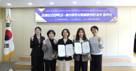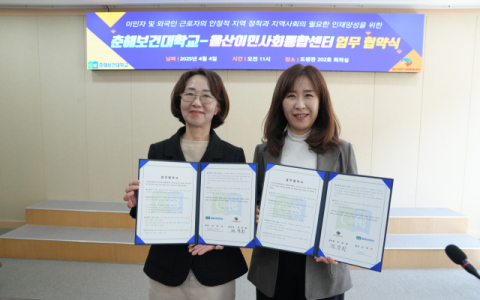 춘해보건대학교(총장 김희진)는 4일 본교 도생관 대회의실에서 울산이민사회통합센터(센터장 정정화)와 업무협약을 체결하고 이민자 및 외국인 근로자의 안정적인 지역 정착과 지역사회 수요에 부합하는 전문 인력 양성을 위한 협력체계를 구축했다.