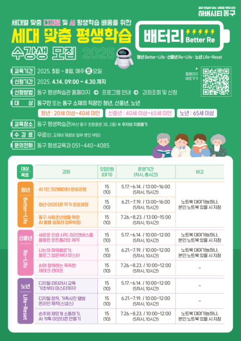 부산 동구(구청장 김진홍)는 세대 간 디지털 격차 해소를 위해 전문 디지털 및 인공지능(AI) 평생학습 사업인 ‘배터리(Better RE)’를 운영한다고 4일 밝혔다.