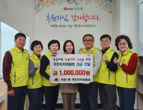 사상구 덕포1동(동장 김미화)은 덕포1동 주민자치위원회(위원장 김영환)가 3일 최근 발생한 대형 산불로 피해를 입은 취약계층을 돕기 위해 대한적십자부산지사에 성금 1백만 원을 기부했다고 밝혔다.