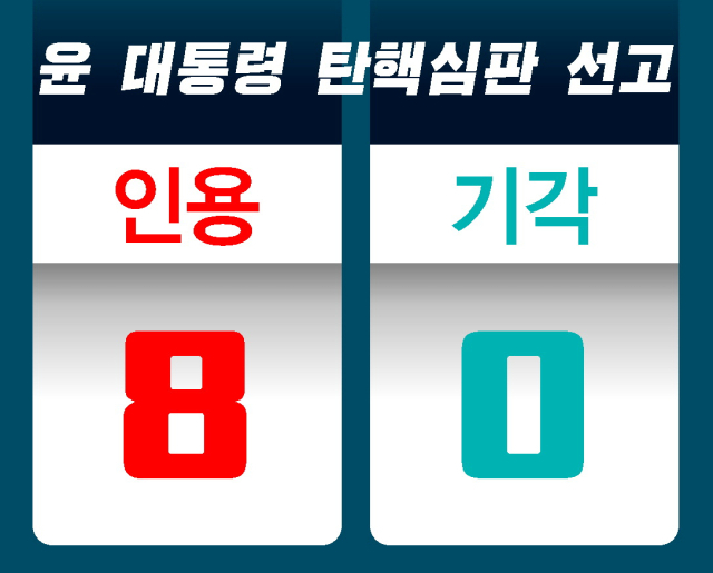 문형배 헌법재판소장 권한대행은 이날 오전 11시부터 시작된 윤 대통령 탄핵심판 선고에서 “피청구인(윤 대통령)은 군경을 동원해 국회 등 헌법기관을 훼손하고 국민의 기본적 인권을 침해해 헌법 수호의 의무를 저버렸다”며 “피청구인을 파면함으로써 얻는 헌법 수호 이익이 파면에 따른 국가적 손실을 압도할 정도로 크다”고 밝혔다. 8인 재판관 전원일치 파면 결정이었다. △내란죄 철회에 따른 절차 문제 △경고성·호소용 계엄 △국회의원 퇴거 명령 부정 등 윤 대통령 측의 주장은 그 어느 것도 인정하지 않았다.
