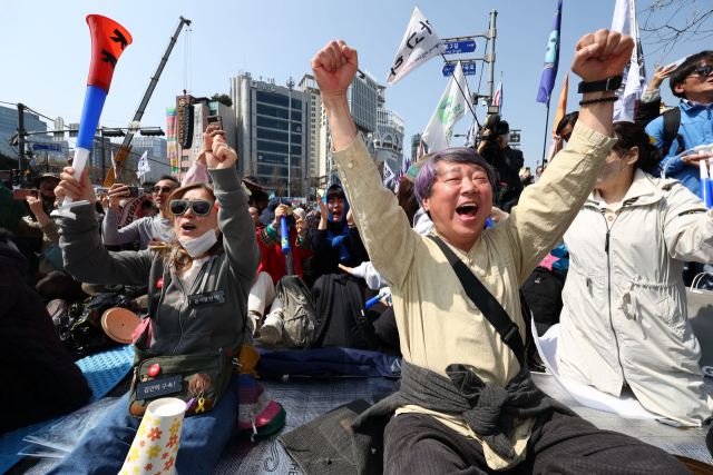 4일 오전 11시 22분, 헌법재판소 앞에서 대형 스크린으로 윤석열 대통령 탄핵심판을 지켜보던 시민들은 ‘파면한다’라는 주문이 선고되는 순간 일제히 환호성을 내질렀다. 감격한 시민들은 그 자리에서 그대로 주저앉았기도 했다. 탄핵 찬성 집회에 주로 사용됐던 소녀시대의 ‘다시 만난 세계’가 울려퍼지자 기쁨에 못 이겨 춤을 추는 이들도 있었다. 윤석열즉각퇴진·사회대개혁 비상행동과 전국민주노동조합총연맹 등은 탄핵 인용 직후 광화문 서십자각까지 태극기를 들고 행진했다. 촛불행동은 이날 한남동 앞 집회를 끝내고 오후 7시부터 서울시청에서 ‘촛불 콘서트’를 열고 기쁨을 나눴다.