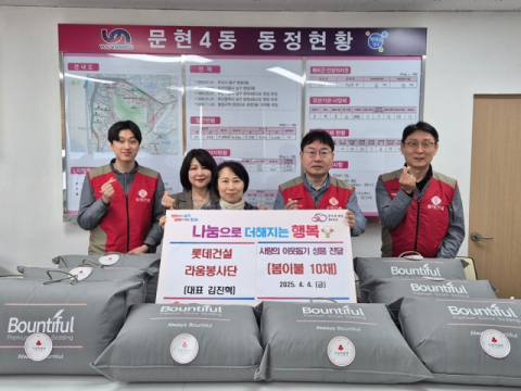 롯데건설 라움봉사단(대표 김진혁)은 지난 4일 문현4동 행정복지센터에 방문해 봄이불 10채를 기부했다.
