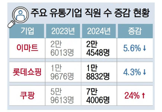 유통업계의 희비는 직원 수 현황에서도 드러난다. 주요 유통기업의 2024년 사업보고서에 따르면 이마트, 롯데쇼핑, GS리테일 등 주요 유통사는 여러 차례 희망 퇴직 등으로 직원 수가 줄어든 사이 쿠팡은 나홀로 직접 고용이 증가했다.