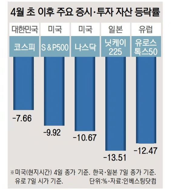 전 세계 증시도 파랗게 질렸다. 트럼프 정부 출범 이후 미국에 협조적인 태도를 취해온 일본과 대만 역시 상호 관세 여파를 피하지 못했다.