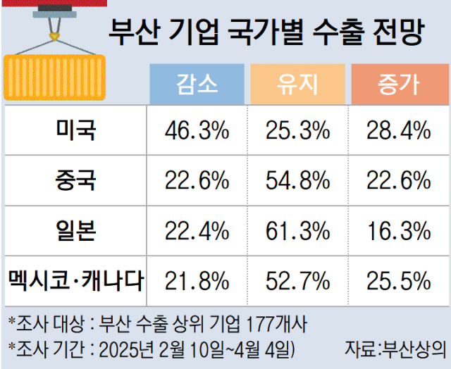 부산상의 조사연구팀 관계자는 “국가 간 문제다 보니 대기업이 아닌 지역 내 중소, 중견기업이 대응할 수 있는 카드가 많지 않다”며 “현대자동차 등을 비롯한 대기업의 대미 투자를 늘린다는 발표는 많지만 지역 기업들은 대미 투자 확대가 기업들이 감당할 수 있는 능력 밖이거나 투자를 하더라도 본격 생산까지 시간이 오래 걸려 불확실성이 높다고 판단하는 경우가 많다”고 말했다.
