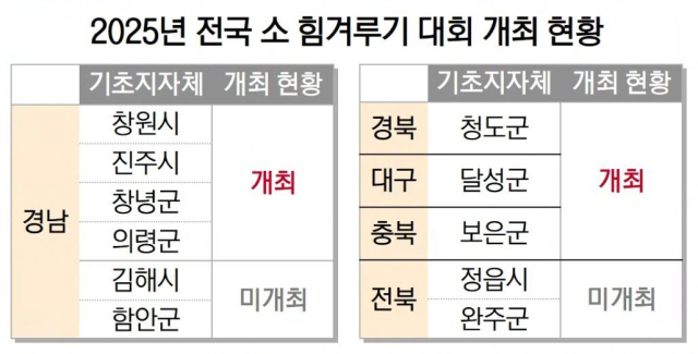 올해 도내에서 전국 소 힘겨루기대회는 창녕과 진주를 포함해 창원·의령 등 4개 시군에서 개최된다. 과거 김해·함안에서도 전국 대회가 열렸으나 2023년 이후 행사가 중단됐다. 관람객 자연 감소 등을 고려한 지자체의 판단이라지만 동물 학대 논란을 의식했다는 게 중론이다.