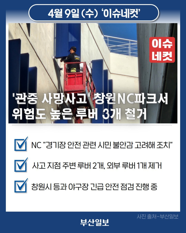 경남 창원NC파크에서 외벽구조물인 루버가 떨어져 관중이 사망하는 일이 발생하자, 프로야구 NC 다이노스는 창원시설관리공단과 소통해 위험성이 높은 루버 3개를 떼어냈습니다. NC는 "제거한 루버는 사고 지점 주변의 내부 루버 2개와 3~4번 게이트 사이 외부 루버 한 개"라고 설명했습니다. 이어 "경기장 안전에 대한 시민들의 불안감을 고려해 관련 기관과 논의한 뒤 선제 조치했다"고 전했습니다. 앞서 지난달 말 경기장 내 설치된 루버가 추락해 야구 관람객 3명이 다쳤고, 이 중 한 명은 치료를 받다 숨졌습니다. 이에 NC는 창원시와 창원시설관리공단 등과 합동 대책반을 마련해 4일부터 야구장에 대한 긴급 안전 점검을 진행 중입니다.